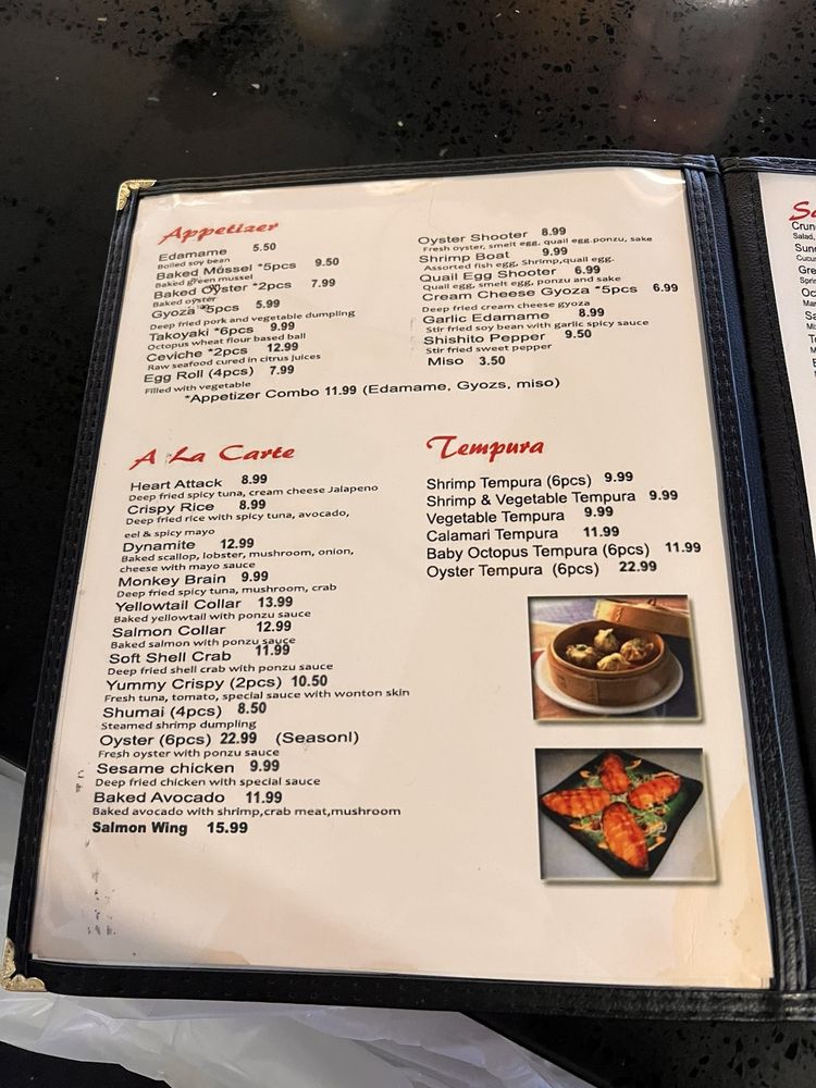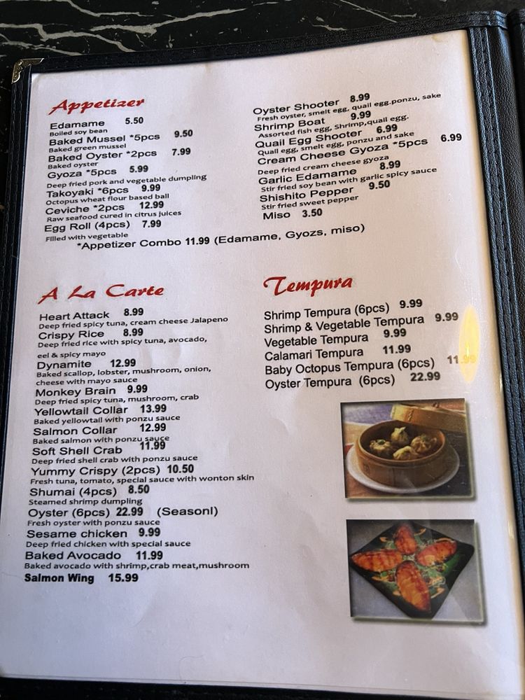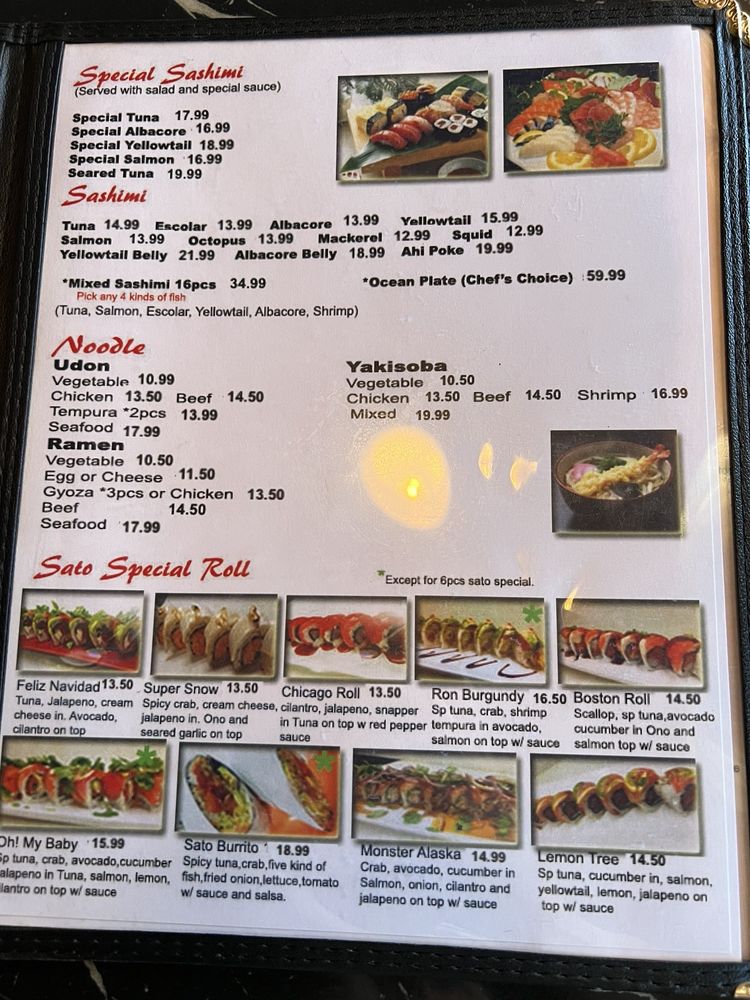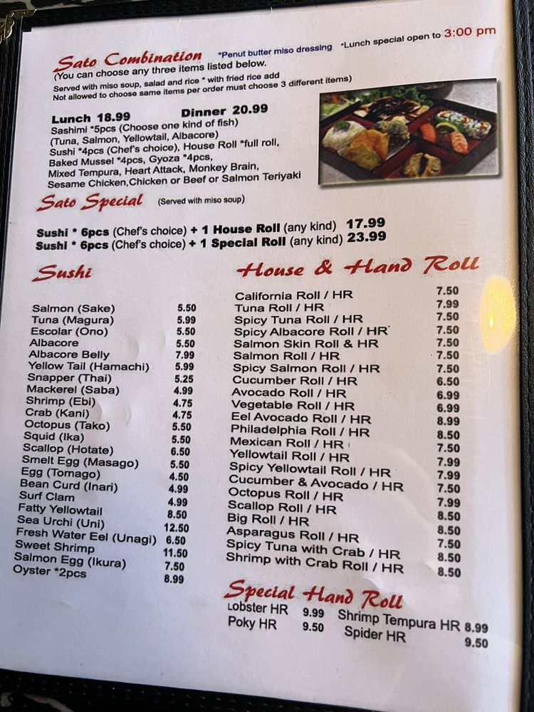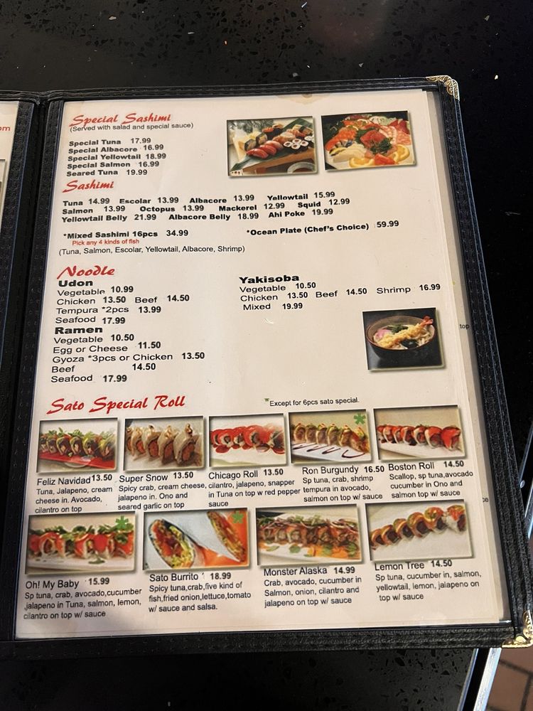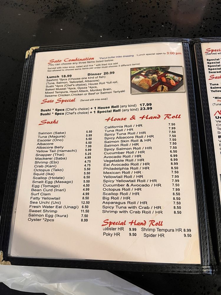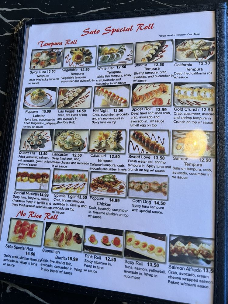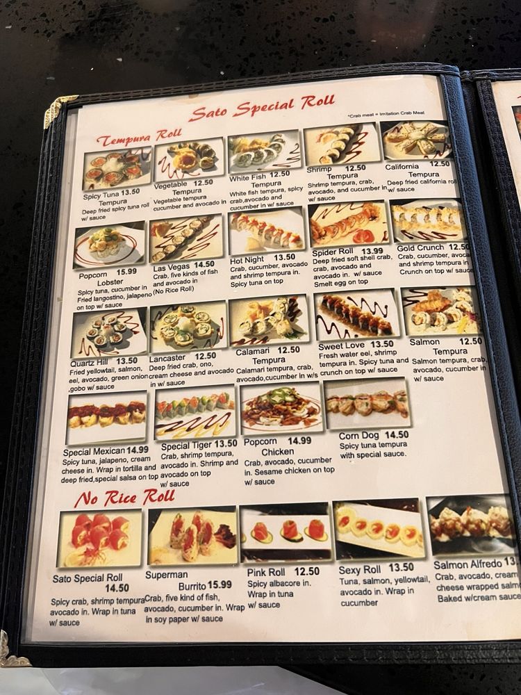 Introducing the menu at Sato Sushi, a Japanese sushi bar located in Lancaster, CA. Sato Sushi offers delivery, takeout, and reservations. The menu includes many vegetarian options, catering services, and happy hour specials. Customers rave about the cozy ambiance and delicious dishes like the Lancaster roll, shishito peppers, and Sato Special roll. The waitstaff is friendly and attentive, providing excellent service. Highlights from the menu include the Heart Attack and Monkey Brain rolls, as well as the Yellowtail collar and baked green mussels. The Super Man Burrito and tempura calamari roll are also recommended choices. Overall, Sato Sushi is a go-to spot in Lancaster for quality sushi and a pleasant dining experience.